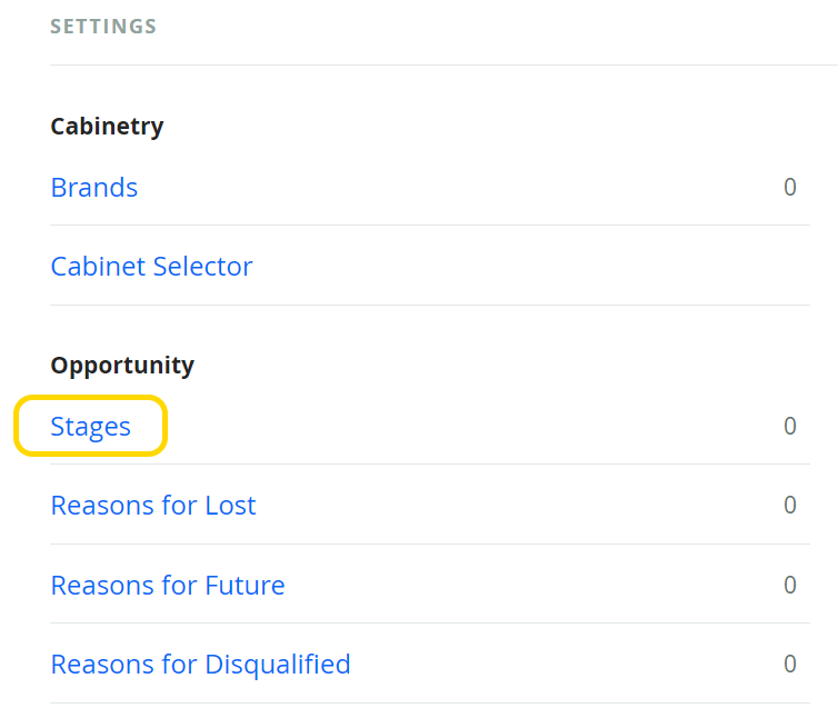 - Under "Opportunities" click "Stages" toward the bottom-left of the center pane.